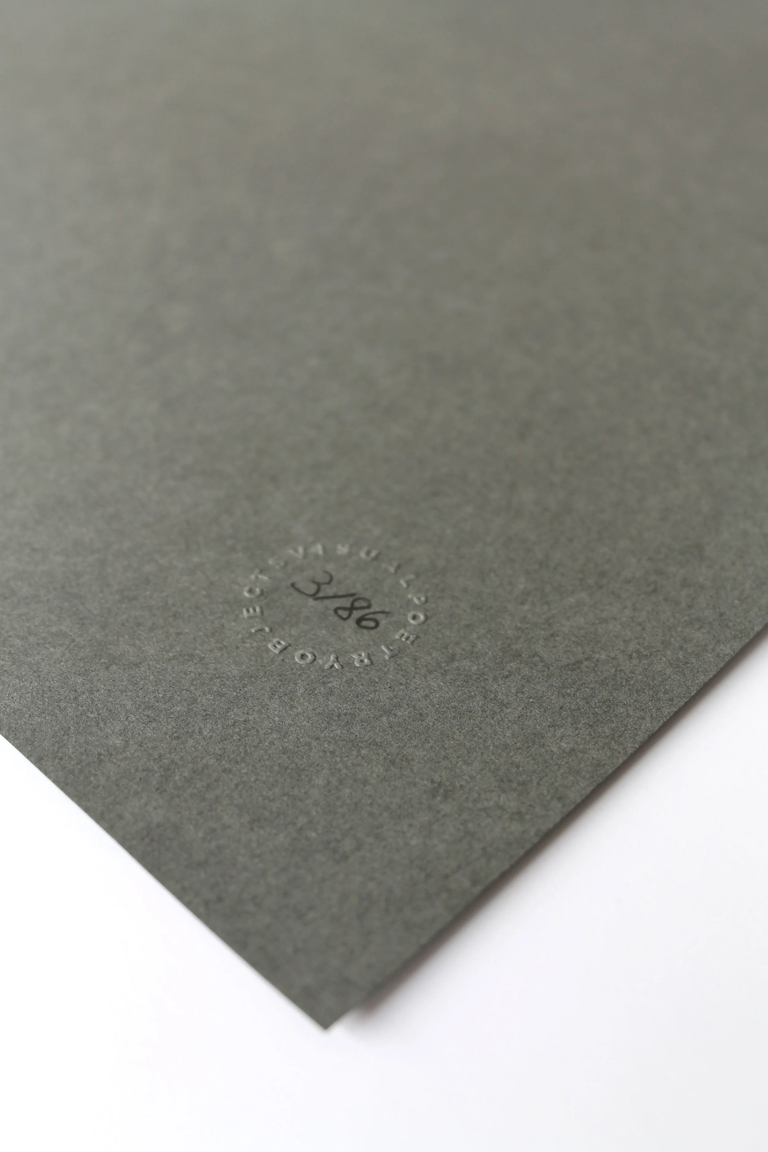 Eigentlich ist es nur ein Tisch. Aber während wir da so sitzen, passiert unser halbes Leben. Eine Tatsache, die dieser ansprechende Handsiebdruck in Worte fasst. Mit transparent-weißer Schrift, die sich dem Untergrund anpasst und auf dunklem Grau wie Hellgrau wirkt. Die limitierte Auflage ist geprägt und nummeriert.